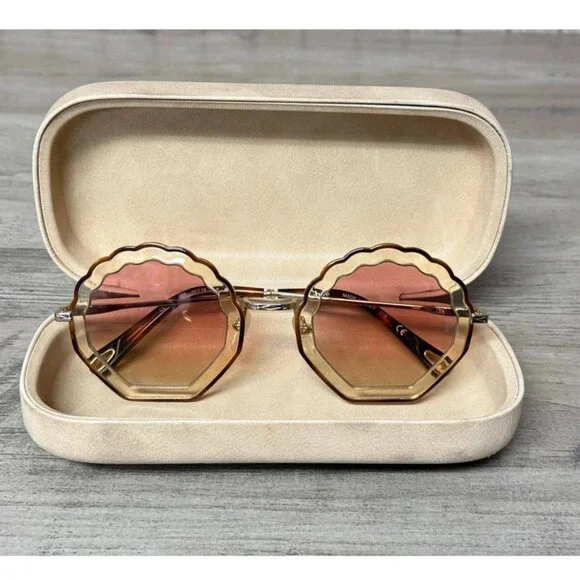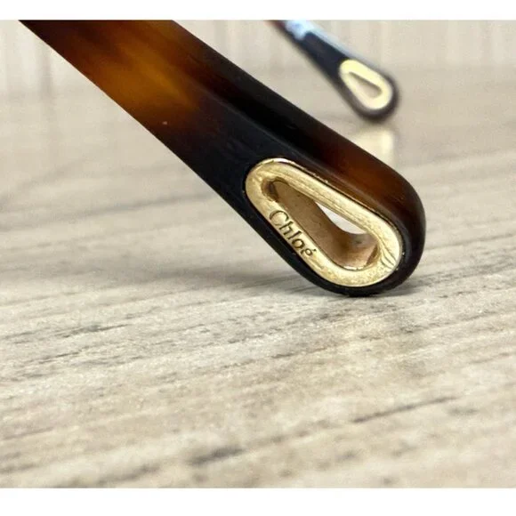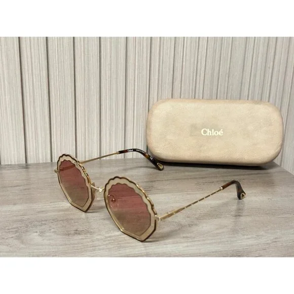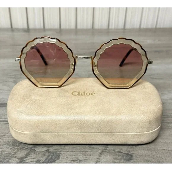 Chloé Gold-Brown Geometric Round SunglassesCondition: Pre-ownedModel: CH0047SThese Chloé CH0047S sunglasses blend vintage charm with modern elegance. Crafted from gold-brown...