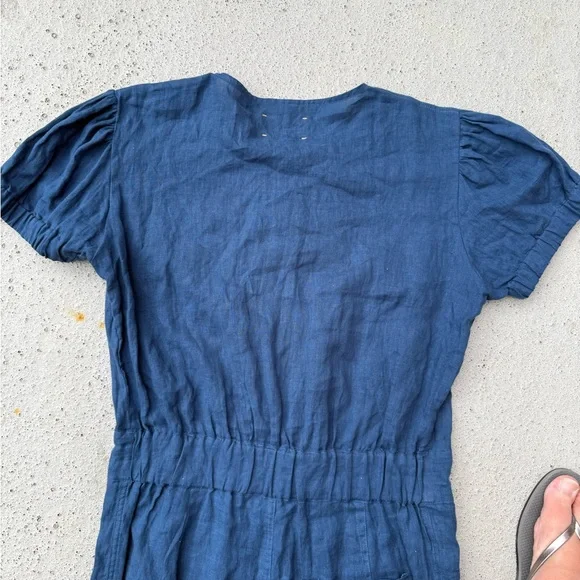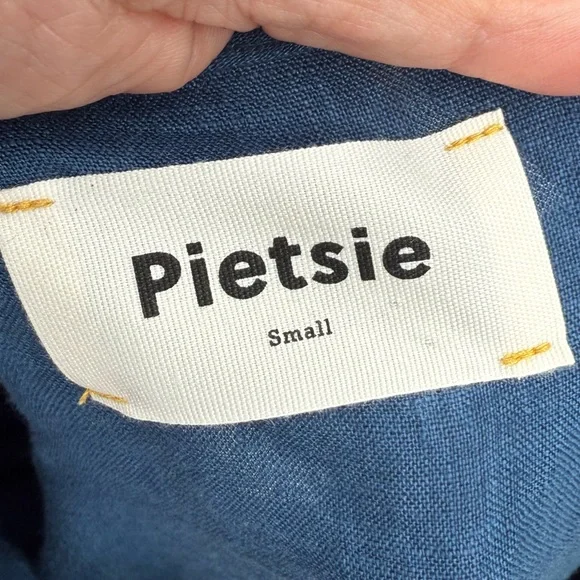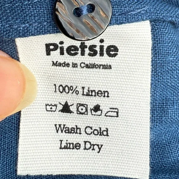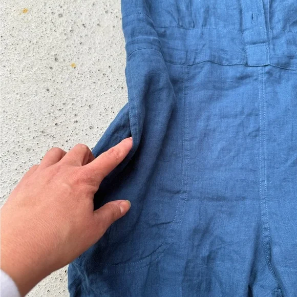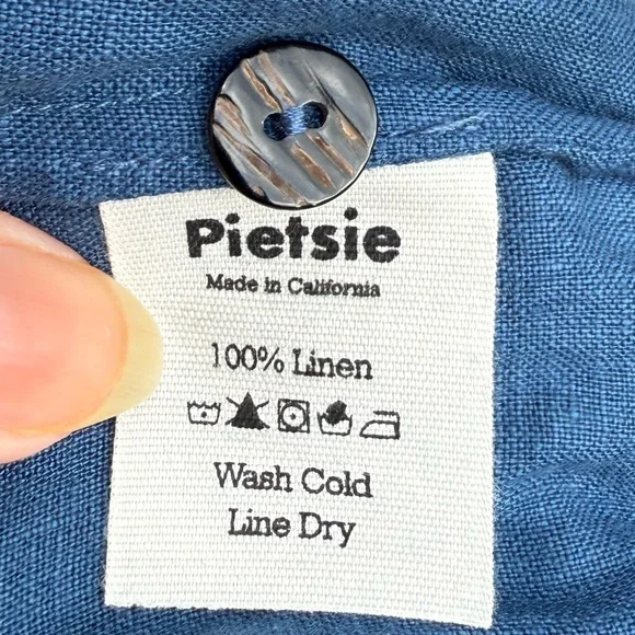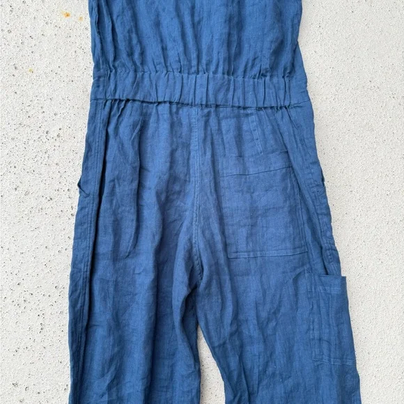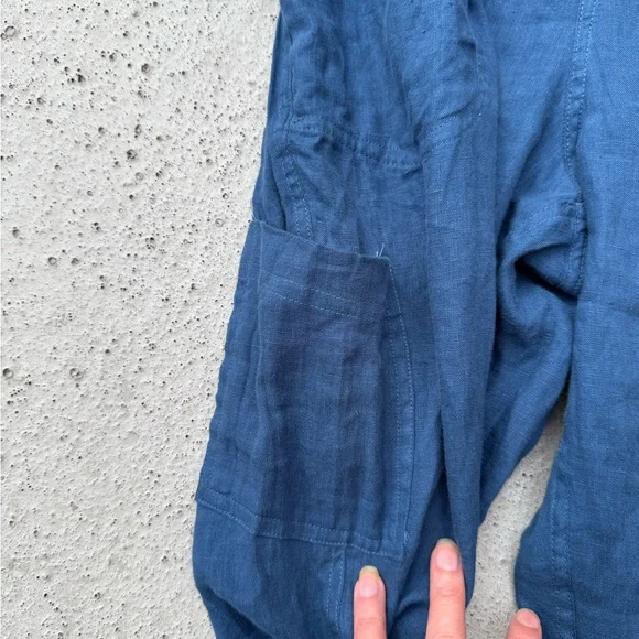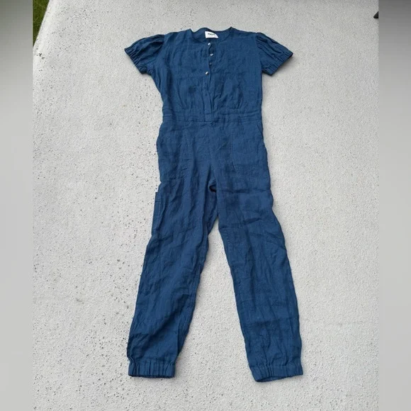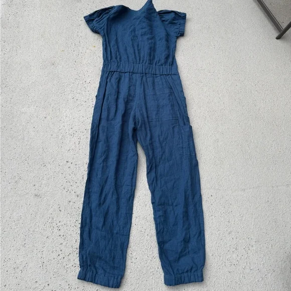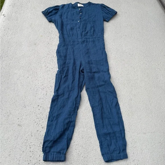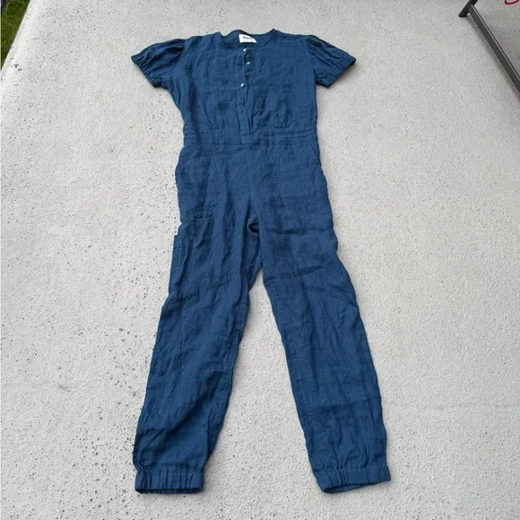 Pietsie 100% Linen Jumpsuit Size Small Good used condition Button front Front/back/side pockets Stylish blue jumpsuit with button-up front. Features short sleeves and elastic cuffs.