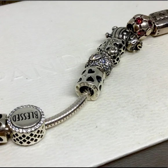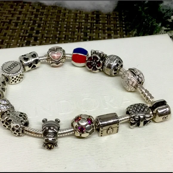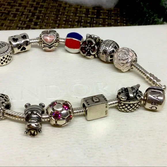 Beautiful Pandora 13 Charms & a Clip to keep all your charms secure!All charms are hallmarked w .925 & ALEChock full of 13 Pandora Charms, all hallmarked & the Openwork charms are hallmarked inside!Also included is a Floral Enamel on sterling silver!Pandora 7.5” Bracelet is also included! We also have a 7.9” if you need the larger size! Please let us know or we will send the 7.5” Pandora Bracelet!Bracelet alone retails for $75Average price of each charm is $35$450