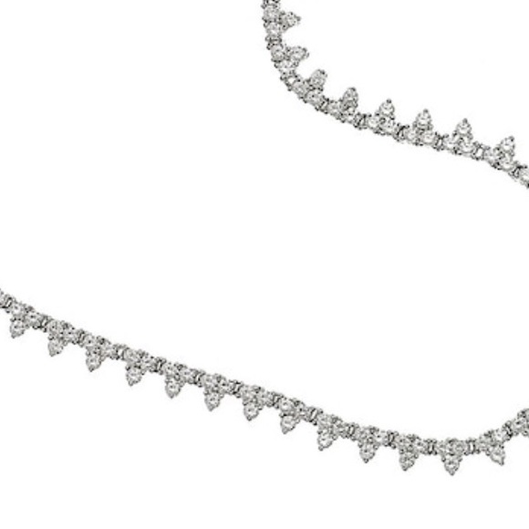 When we saw this necklace in diamonds, our designer was determined to recreate it in a Cubic Zirconia.The result is simply put “drop-dead” gorgeous!! Using the highest quality Cubic Zirconia, our artist has hand-set them into a triangular pattern that is unique and looks like points of trillions.18” lengthSterling Silver w Platinum BondingCubic Zirconia