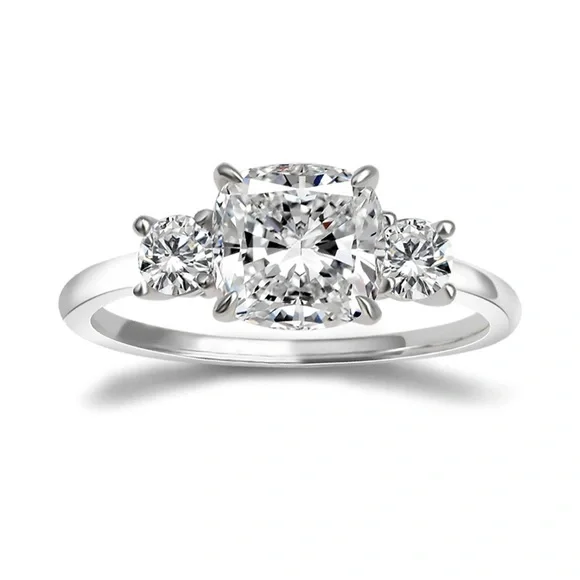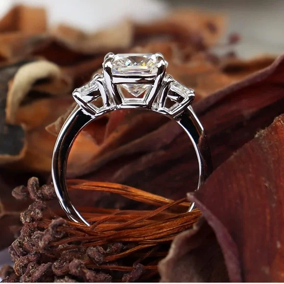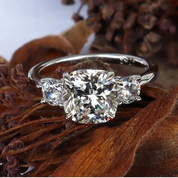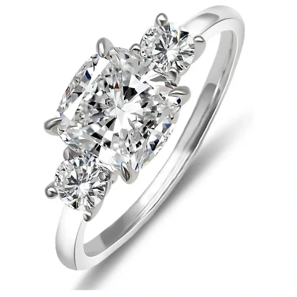 Size 7.5 2 carat center Moissanite Diamond Cushion .25 round cut diamonds on both sides Inspected by jeweler and tests positive as Diamond in thermal device. 14k white gold PLATED over 925 Sterling silver Clarity: VVS2 Cut: ExcellentColor: D The pictures don’t show the fire this ring has, it’s a breath taking ring in person.