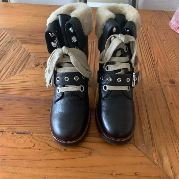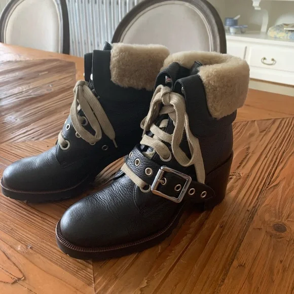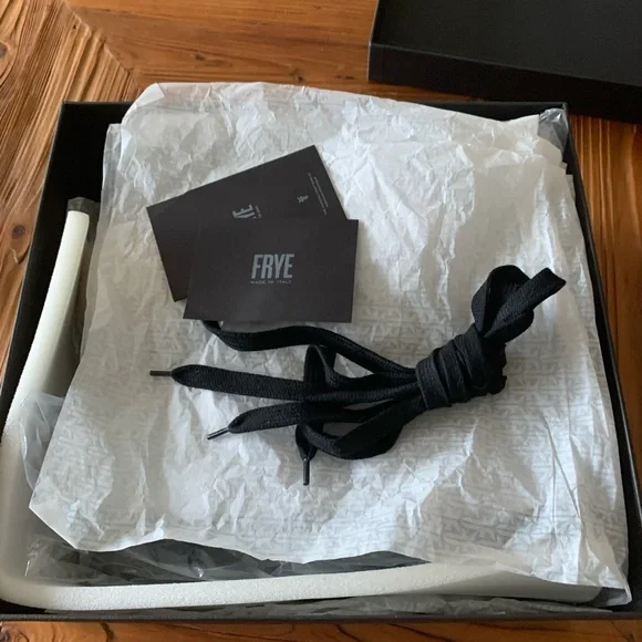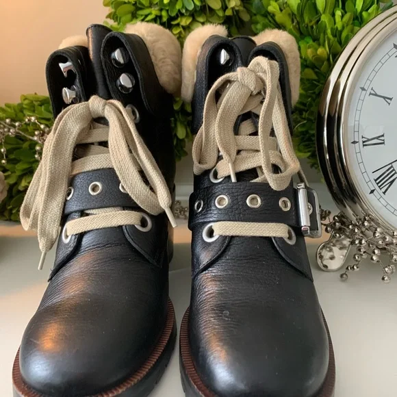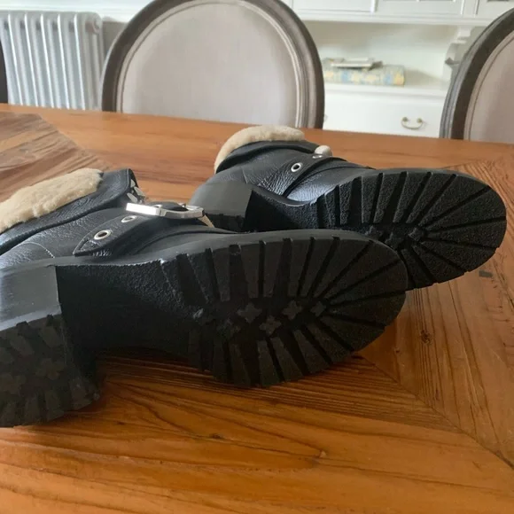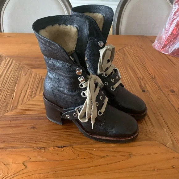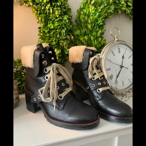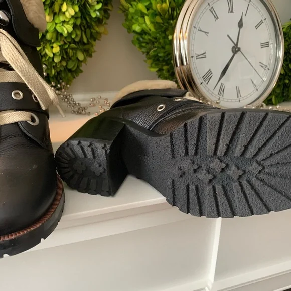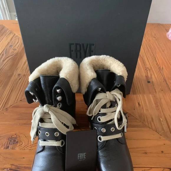These Italian made boots are cut from deerskin leather and designed to sit just above your ankle, they are punctuated with silver-toned buckled straps and bold lace-up eyelets. Fuzzy 100% shearling fold over lined cuff interior. Footbed is leather. approximate 2.75” heel. Normal width.Round toe/adjustable buckle/lightly padded leather insole. Comes with extra pair of laces. Dust cover/Frye authenticity card and perfect box comes with purchase.