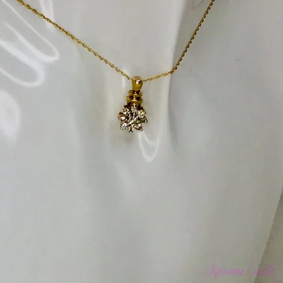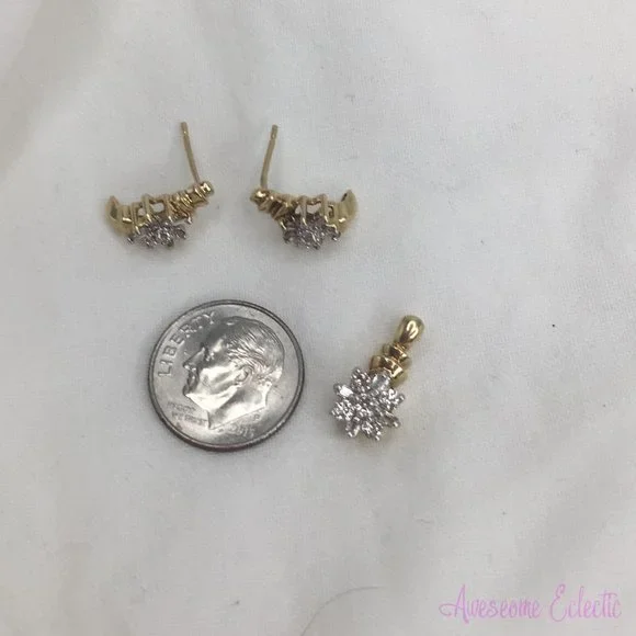 Diamond flower/starburst earrings & pendant in 10k yellow gold. Purchased around 2005. I don´t remember the carat weight but the stones are excellent and clear.No damage/chips to any of the stones and all are secure in their settings. Rarely worn and shows little wear. This set will not come with backs or a chain.Will ship within 24hrs of purchase, usually on the same day. I clean all jewelry prior to shipment.Message me with reasonable offers.LMK if you have any questions.Thanks!
