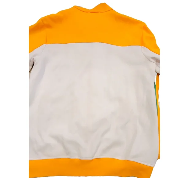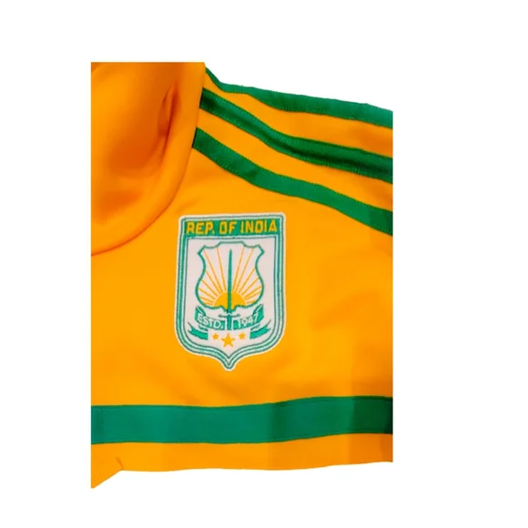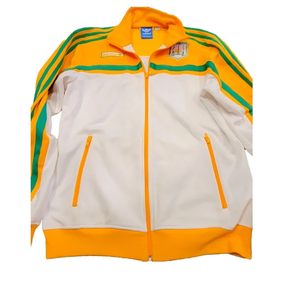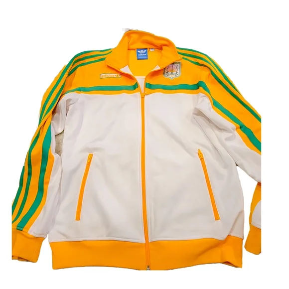 INDIA TRACK TOP Zip-Up Men´s Size - MColor - White/GoldPay respect to the Republic of India in the adidas India Track Top, an iconic style dressed up in national colors and trimmed with country-inspired graphics. This track jacket features the 3-Stripes on the sleeves for authentic Adidas flavor.Front zip pocketsFull-front zipStand-up collarRibbed cuffs and hemEmbroidered India-inspired crest on left shoulder; Contrast detailsApplied 3-Stripes down sleevesAdidas wordmark and Trefoil patch on right shoulderBody: 85% Polyester/15% Cotton; Rib part: 60% Polyester/35% Cotton/5% SpandexExcellent condition!