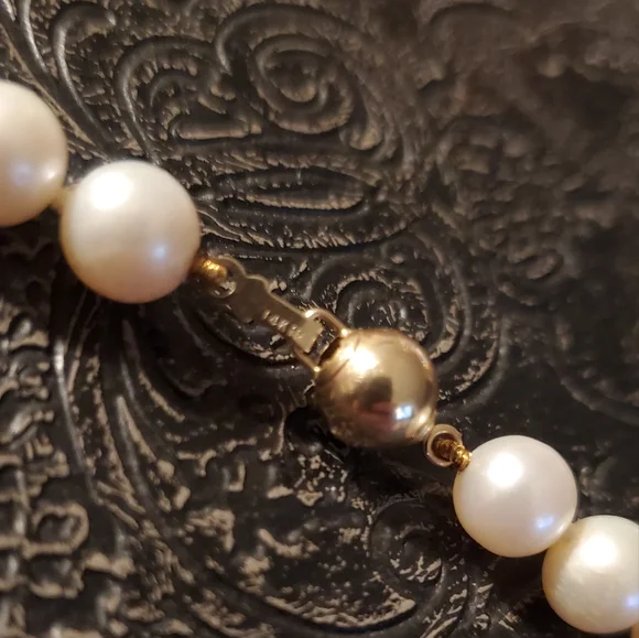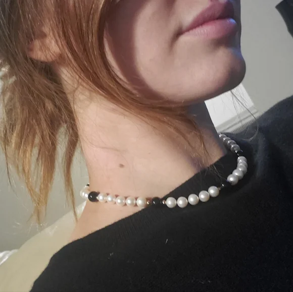 14k Gold hardware on a beautiful 13" white pearl necklace with black pearl accents. beautifully crafted. small bubbles in some of the pearls,you can see the imperfect shape to some of the pearls since each are unique and different. Feel free to ask any questions!