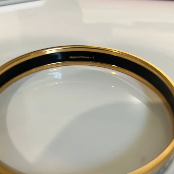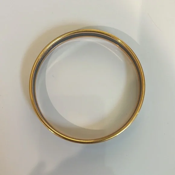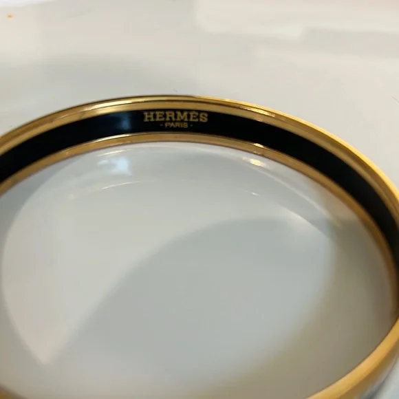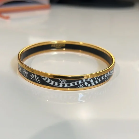 Beautiful, authentic Hermes narrow black and white enamel bangle bracelet. Barely worn and in good condition. Gold bracelet with black and white pattern enamel. A classic jewelry staple.