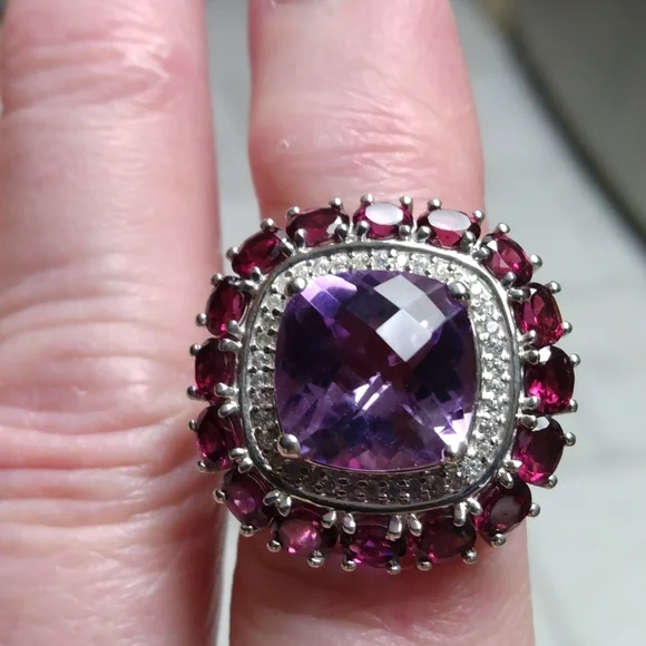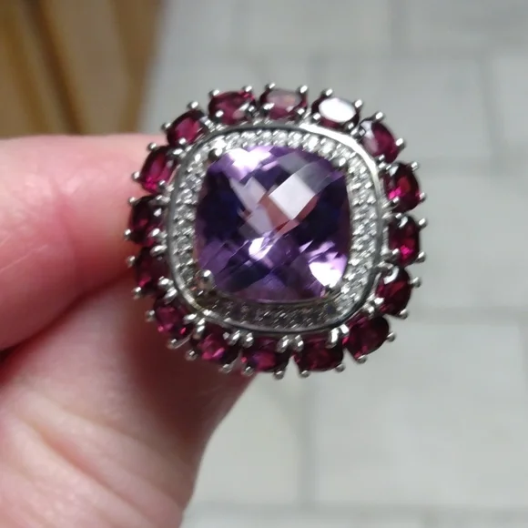 Stamped .925 Kunzite, Orissa Rhodolite Garnet and Zircon Ring.Size 7