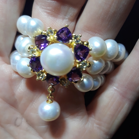 Lovely real pearls are featured in this yellow gold over sterling silver 3 strand bracelet. The medallion has genuine amethysts while the clasps are dotted with genuine rubies. Breathing. 7 inches