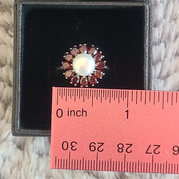 Beautiful Freshwater White Pearl & Mozambique Garnet ring set in Platinum over Sterling Silver nickel free size 7, TGW 5.20cts. This is a beautifully classic ring that will add to any outfit.Spoil yourself or that someone special this holiday. Please feel free to ask any questions.
