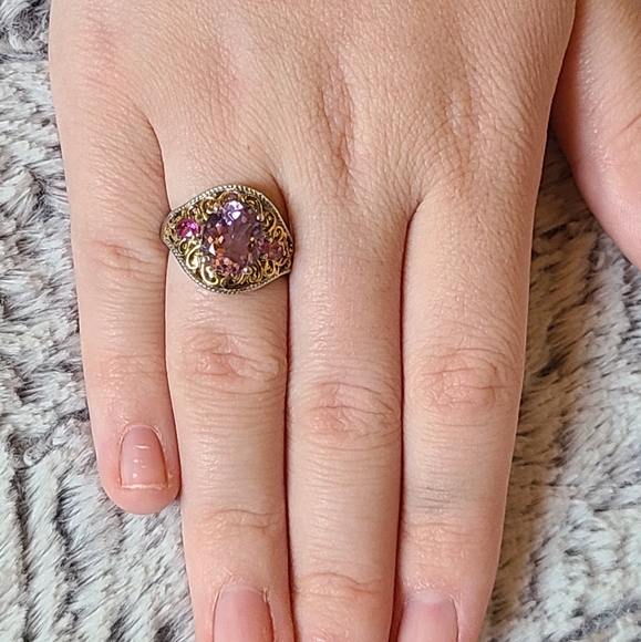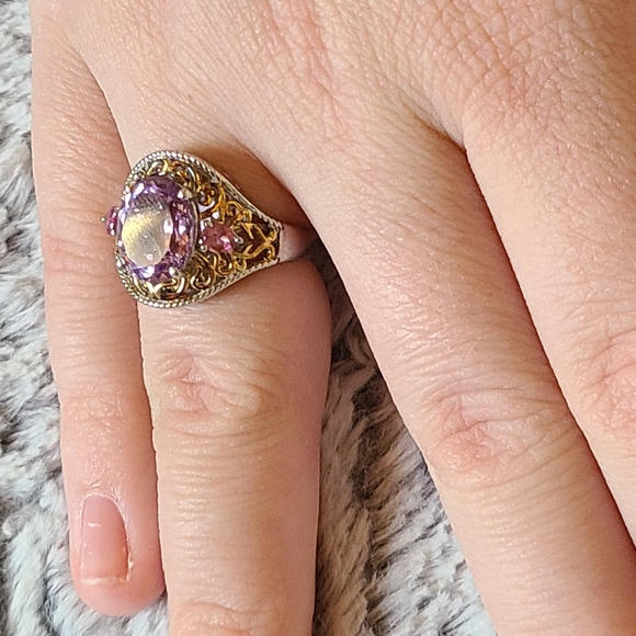 Beautiful Rose De France Amethyst (ovl 3.20cts) & Pink Tourmaline Filigree ring set in Platinum over Sterling Silver nickel free accented with 14kt YG size 6, TGW 3.50cts. This is a gorgeous ring with pink blush colored natural Amethyst.Perfect gift for this holiday.Spoil yourself or that someone special this holiday season. Please feel free to ask any questions.