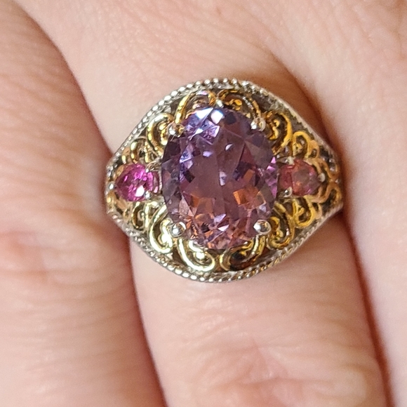 Beautiful Rose De France Amethyst (ovl 3.20cts) & Pink Tourmaline Filigree ring set in Platinum over Sterling Silver nickel free accented with 14kt YG size 6, TGW 3.50cts. This is...