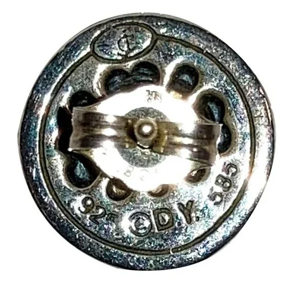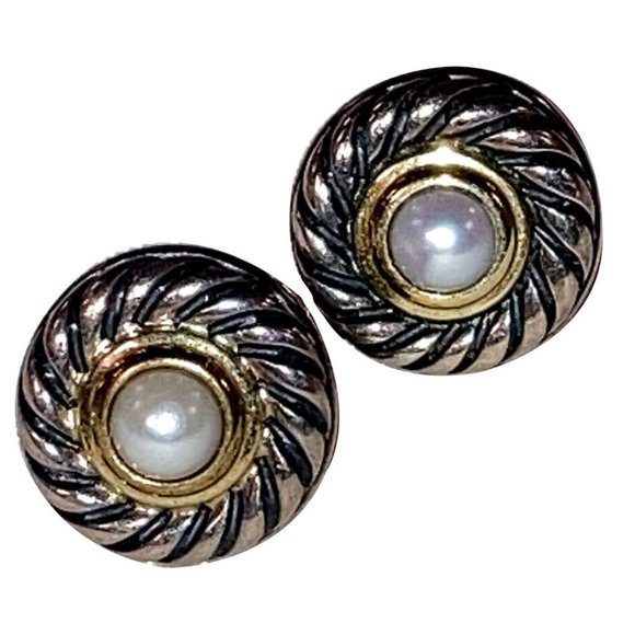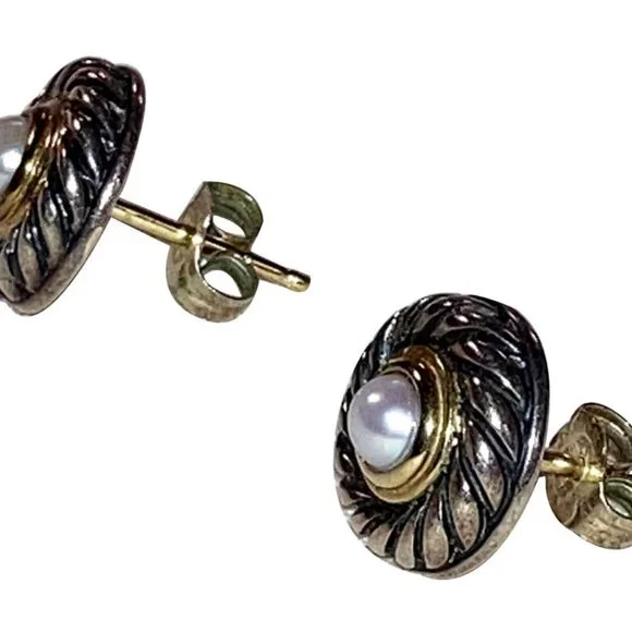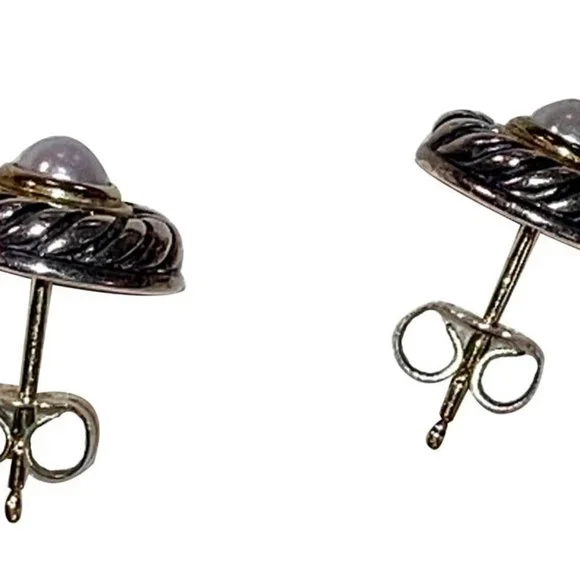 David Yurman Cultured Pearl Earrings in Sterling Silver with 14 kt Gold, 4 mm pearl.Circa, 2000.Measures 1/2" diameter.Earrings are post for pierced ears.Marked, D.Y., 925, 585...