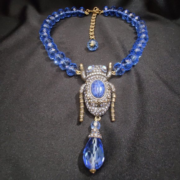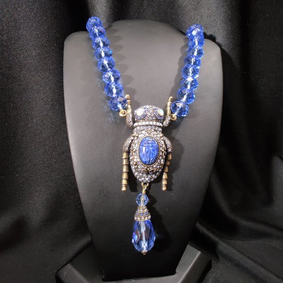 I´m in love with this! Art Deco influence Egyptian themed Scarabnecklace by Heidi Daus. Stunning sparkly blue crystal beaded necklace with blue pave rhinestone bronzed metal scarab pendant with drop crystal. Large, STATEMENT piece! This is new without tags, kept lovingly by a collector, never worn. This is a retired piece in hard-to-find blue.Condition: New. No storage wear.Mark: Heidi Daus on back of scarab.Measures: Necklace 21-1/2" long including 4" extender. Pendant is 4-1/2 x 1-1/2"Please do keep in mind that any vintage and/or antique merchandise may have some degree of visible wear or patina. This is considered quite normal and can be a part of the overall appeal and charm. We do our best to mention any specific condition issues we find. All items have been cleaned and are described to the best of our knowledge.If you have any questions please feel free to contact us, happy to answer any questions you may have.