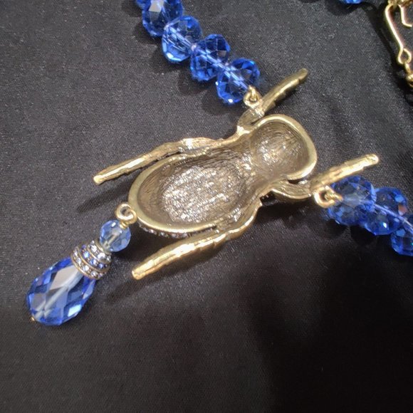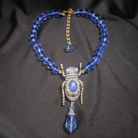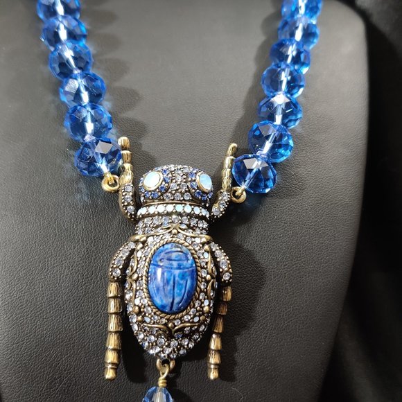 I´m in love with this! Art Deco influence Egyptian themed Scarabnecklace by Heidi Daus. Stunning sparkly blue crystal beaded necklace with blue pave rhinestone bronzed metal...
