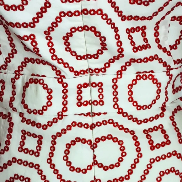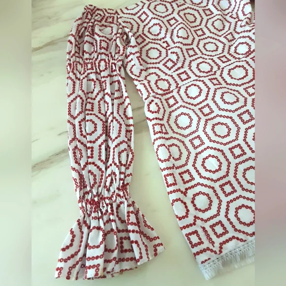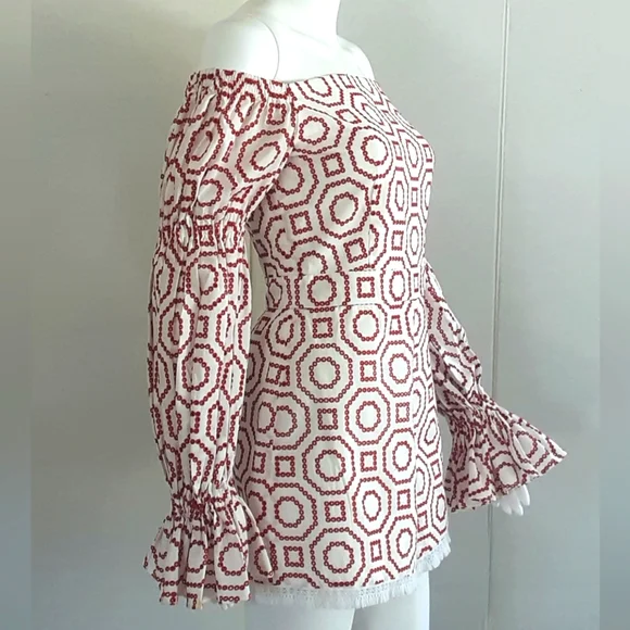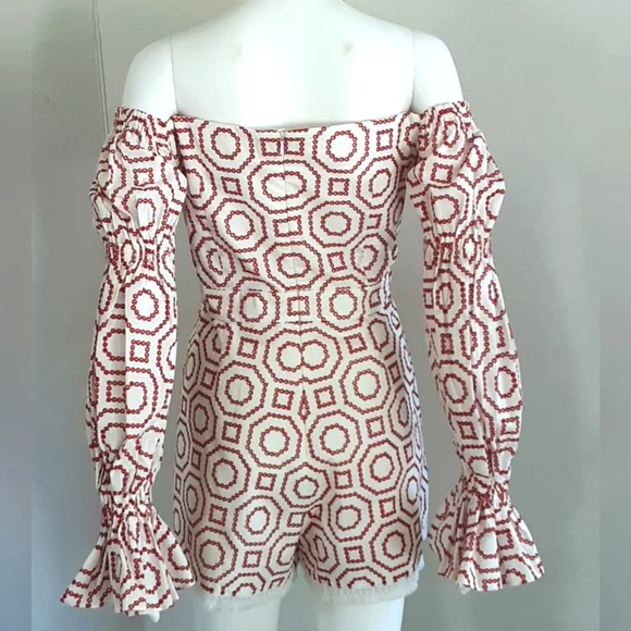 ALEXIS Kizzy White Off The Shoulder Red Eyelet Geometric Print Romper.Stylish, high fashion, off-shoulder romper with a red eyelet geometric embroidered pattern.This eye-catching bright red and white romper from Miami designer Alexis is the perfect balance between quirky and chic.With a stylish off-the-shoulder neckline, on-trend gathered bell sleeves with ruffled cuffs, 1.5" wide waistband, fully lined, back hidden zipper and white fringed hem.Add this whimsical, striking textile, one piece garment Kizzy Romper to your Summer wardrobe. Good Gently Used Pre-Owned Condition - Freshly Dry Cleaned. Self & Lining: 100% cottonContrast: 100% rayonDry clean onlyMeasuring Approx. PTP 18"Waist 15”Hips 19”