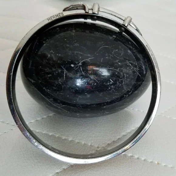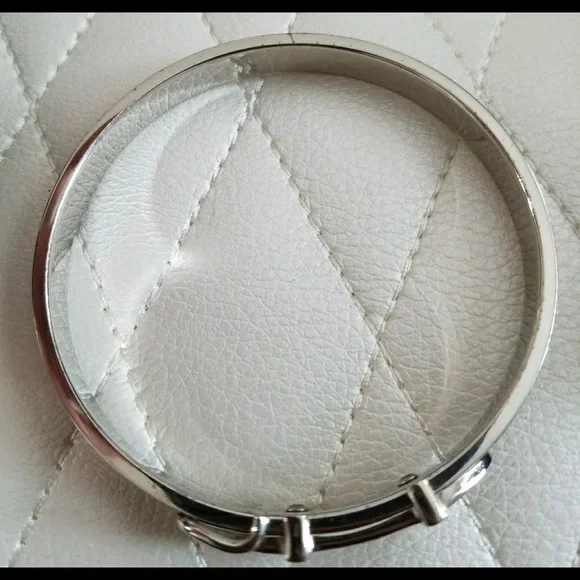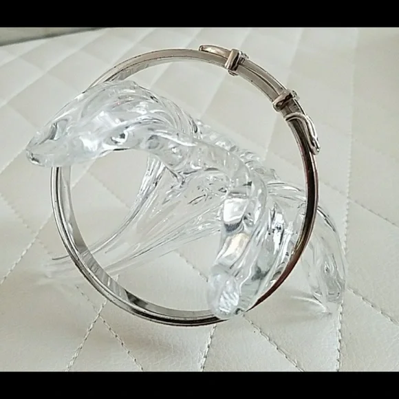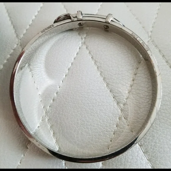 Authentic vintage Hermes real silver bracelet in the shape of a belt.Light brown leather accent.Mild scratching on metal as pictured.Used.
