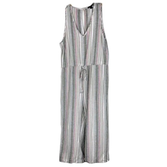 DREW Anthropologie Jumpsuit Romper Olive Striped Combo NWT This Jumpsuit Romper by Drew / Anthropologie is the ultimate in leisure attire. It is versatile and can be dressed up or down from binge watching on your sofa to going out. This is an olive combo color. Jumpsuit has a palazzo style pant leg with a v neck tank top. Waist has an adjustable drawstring which can be worn loose or fitted. Relaxed fit with a subtle touch of sophistication.New with tags, never worn.* Runs Large* Subtle texture* Tank Style* Drawstring tie waist * Hand wash cold* Imported* Style# TJ5337