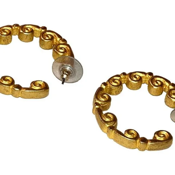Karl Lagerfeld Scrollwork Hoop Earrings, 18 kt gold plated with a matte finish over costume metal.Cira 1990´s.Hoop earrings measure 1 1/2" diameter and 1/4" wide.Post...