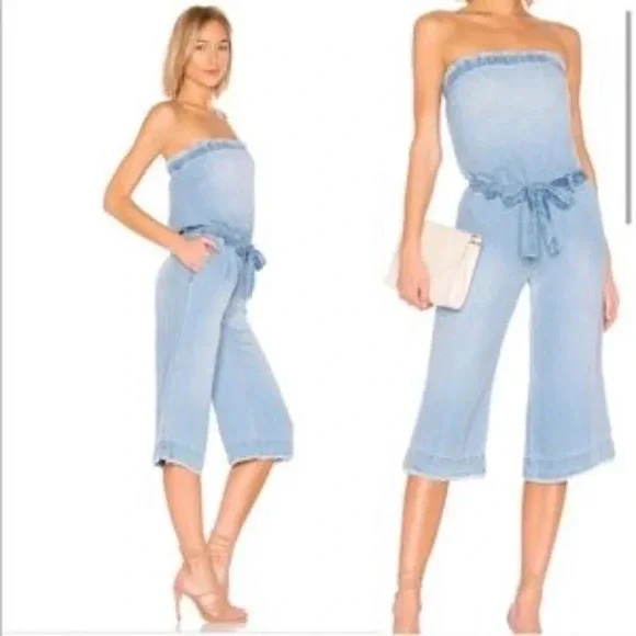 Bella Dahl Strapless Chambray Frayed Jumpsuit in a light blue denim wash. It´s a relaxed-fit denim jumper with a cropped wide-leg pant, distressed frayed edges at the hemlines Underarm to underarm: 13”(W)•Across waist: 13”-13.5”(W)•Inseam: 20”(L)•Outseam: 28”(L)•Front & back rise: 10”•Across thigh: 11”(W)Elasticized neckline and waistBelted waistSide seam pocketsFrayed edgesSlant hip pockets100% tencelDry cleanBelt not includedNew without tags** Excellent Condition