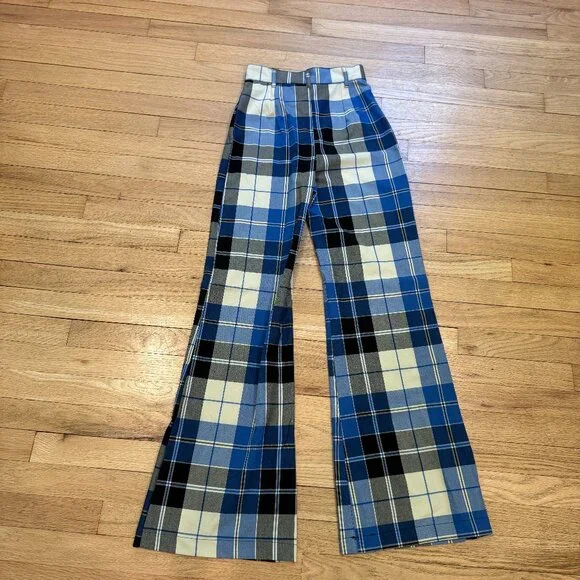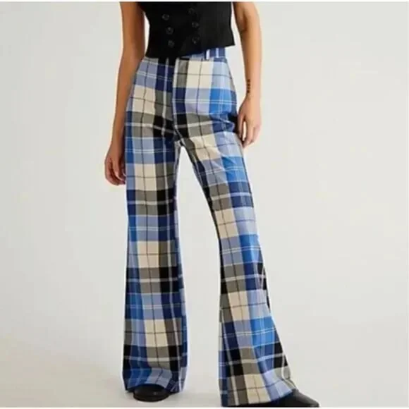 Free People Jules High Waist Plaid Flare Pants Blue/Black NWOT Size 0 (XS)