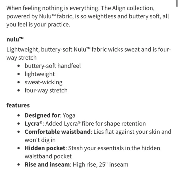 Excellent condition size 8 25” align leggings.No stains, holes, flaws, or pilling. Riptag removed but size dot intact.