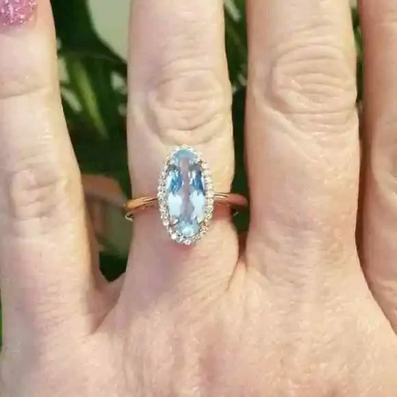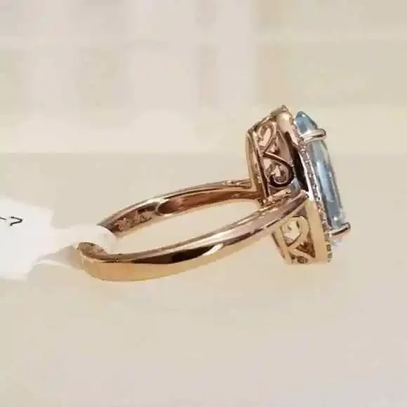 Victorian Blue Topaz Diamond Rose Gold Halo Ring