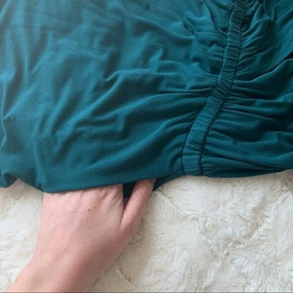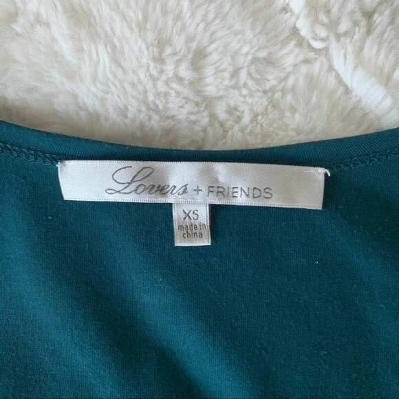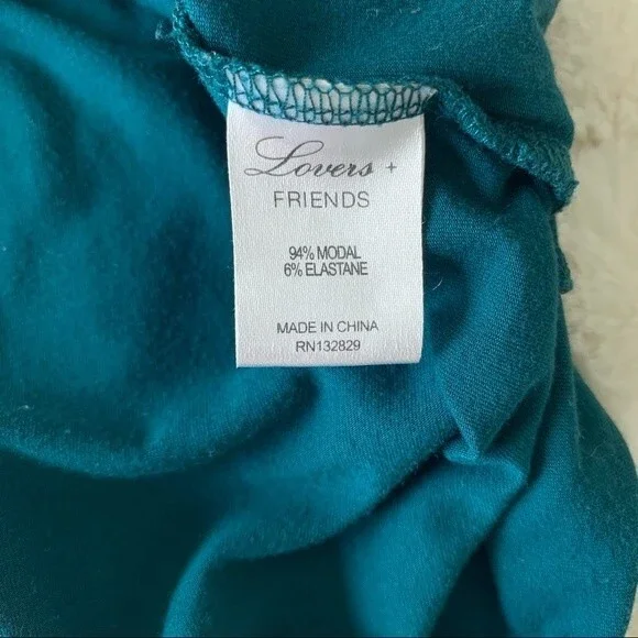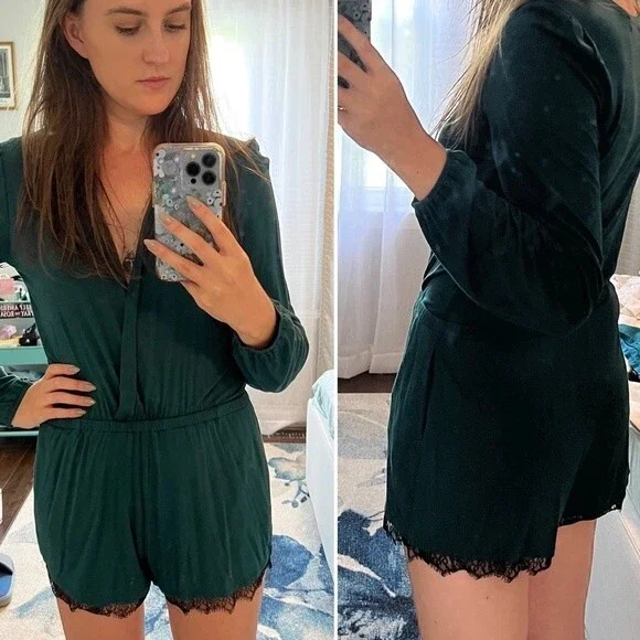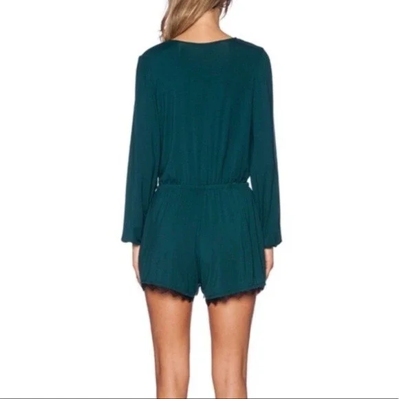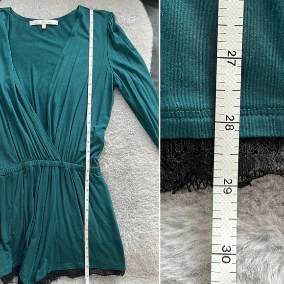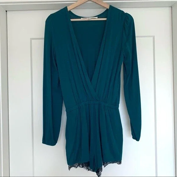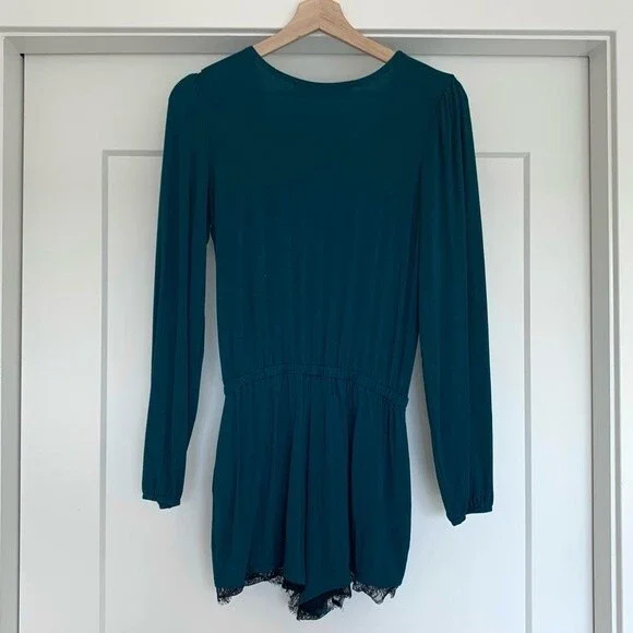 Teal romper from Lovers + Friends. Long sleeves. Pockets. Black lace trim. Stretchy waist. Deep plunge v-neck surplice front (could probably be safety-pinned or stitched to make it more modest). Super soft modal / elastane blend. Size XS. Excellent used condition.