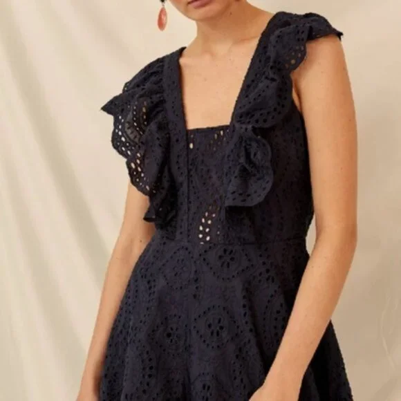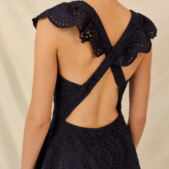-Invisible zipper-Partially lined-Embroidery anglaise-Fitted-Features; frill detail-Detachable cross over straps