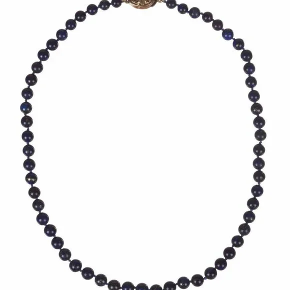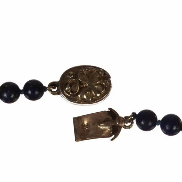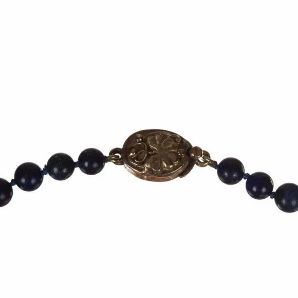 Gorgeous lapis lazuli bead necklace with a circular, yellow gold box clasp.Box clasp form a shamrock, the Irish traditional symbol of luck.Circa, 1950’s.Necklace is 20” long,...