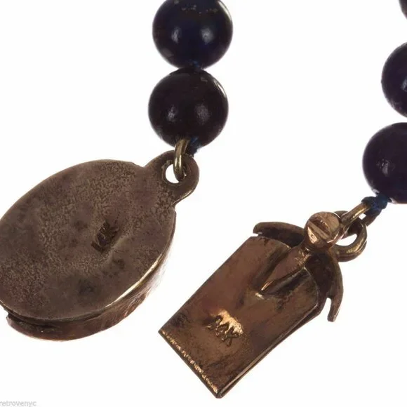 Gorgeous lapis lazuli bead necklace with a circular, yellow gold box clasp.Box clasp form a shamrock, the Irish traditional symbol of luck.Circa, 1950’s.Necklace is 20” long, and almost ¼” wide.Each lapis lazuli bead measures, 7 mm’s in diameter.Closes with 14 kt yellow gold box clasp.Marked, “14k” for 14 karat gold.Weighs, 40.5 grams.A great piece to add to any woman’s wardrobe.