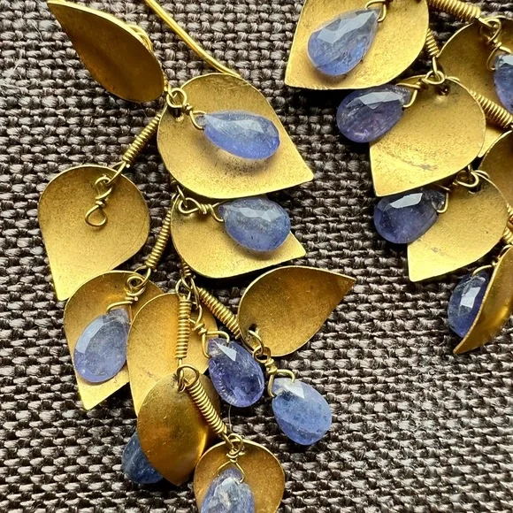 Pair 18k Yellow Gold Chandelier Earrings with Petals & Sapphires.