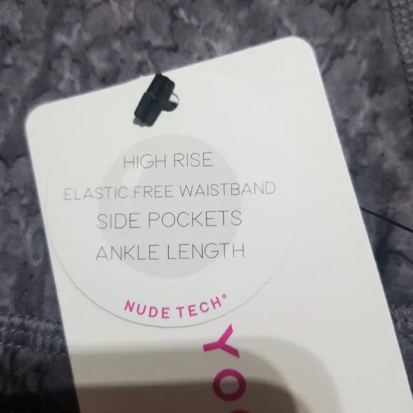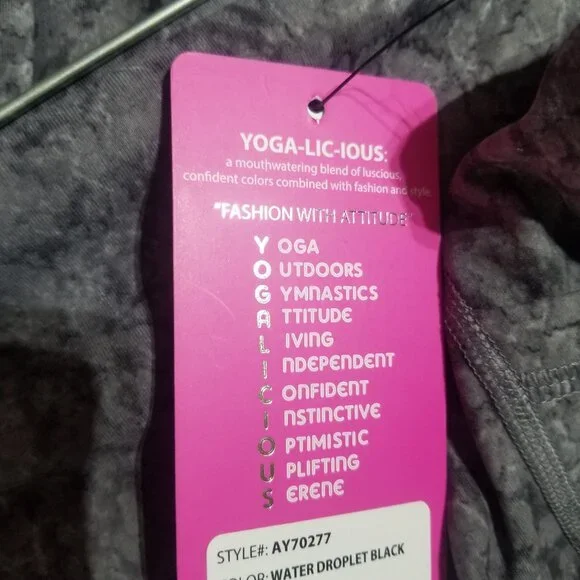 Yogalicious Nude Tech Water Droplet Black Size XXL Brand New with TagsBody: 86% Polyester/ 14% SpandexStyle: AY70277Color: Water Droplet BlackSize XXL (1-96069-14917-7):Waist 29Front Rise 12,Back Rise 14,Leg opening 10,Inseam 24-1/2,Length 25