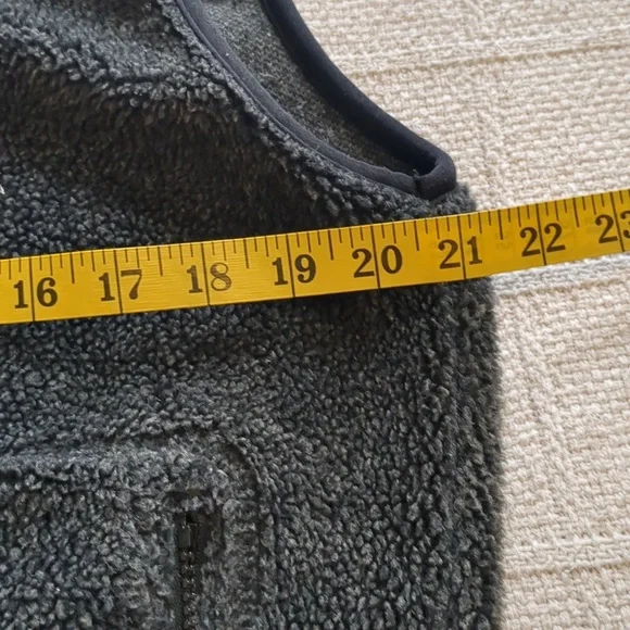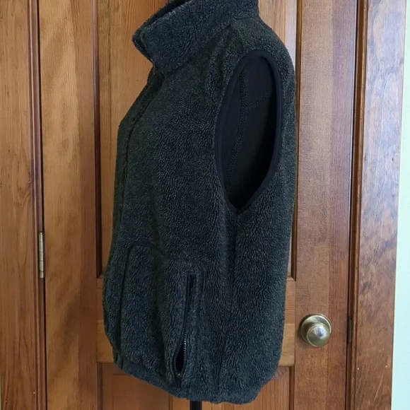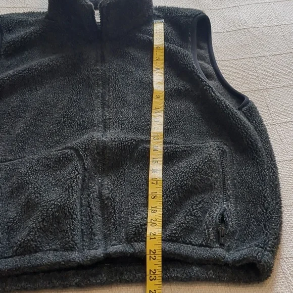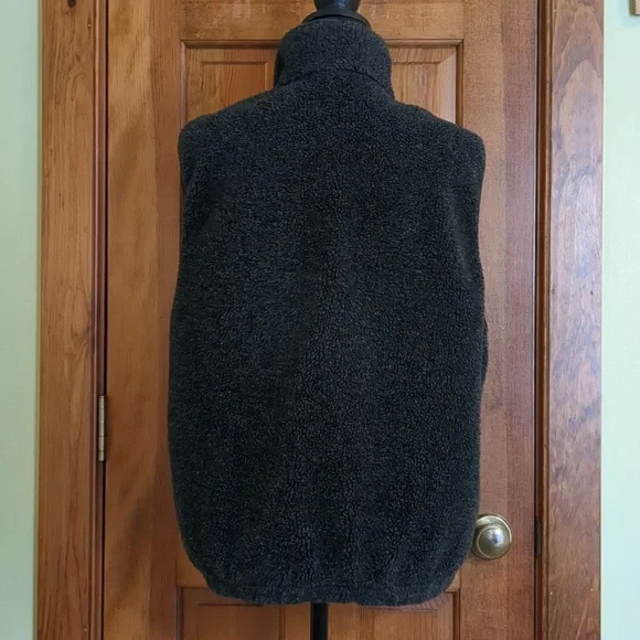 Stay warm and stylish with this dark gray fleece vest. Perfect for layering, it offers comfort and versatility for any occasion. Front zip, high collar, zip pockets.Size MPlease see photos for measurements