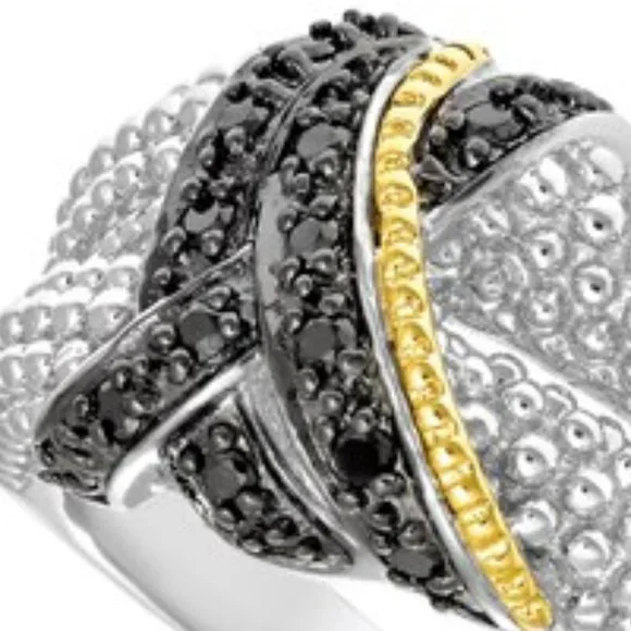 Fabulously gorgeous, this 18k yellow gold and rhodium-plated sterling silver ring features a dual-style popcorn band with intertwined black diamond-accented sectionsProduct Details:Ring InformationMetal:925 Sterling and 18KYellow Gold & Sterling Silver Available Sizes: 7-9Diamond InformationMin ct. tw.:0.14Shape: RoundAverage Color: JAverage Clarity: I2