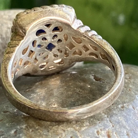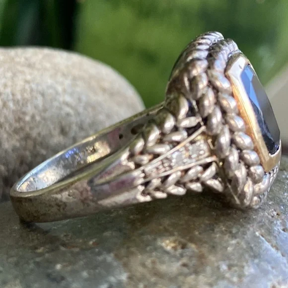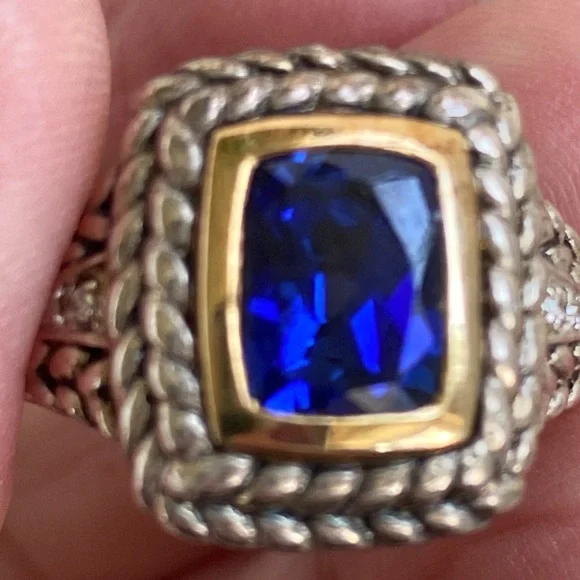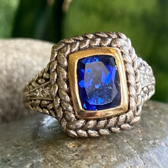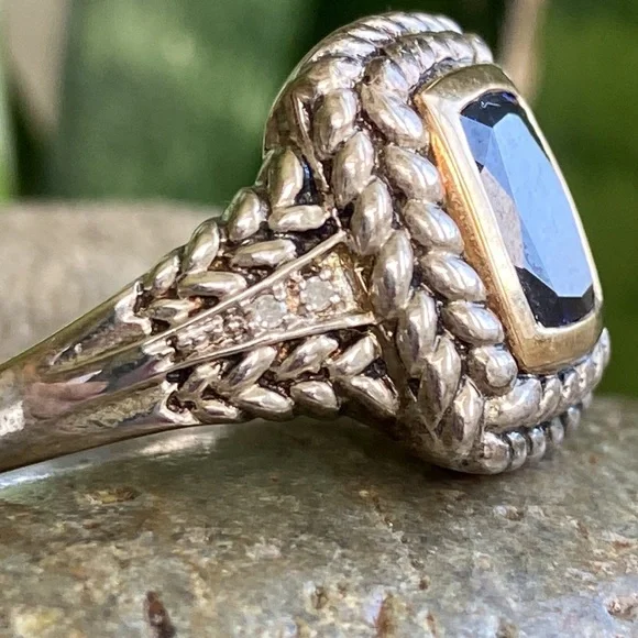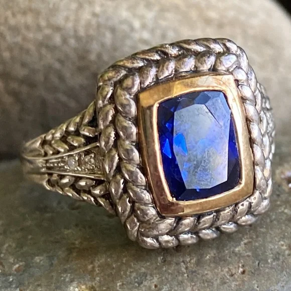 14 karat gold and sterling silver with diamonds and blue stone ring