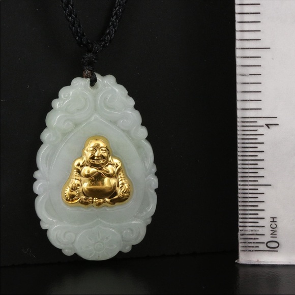 Style: Asian, Buddhist, ReligiousMaterials: 24K Gold, CordNecklace Length: 24.00", 17.50"Hallmarks: Chinese Fineness Marks Total Weight (grams): 9.20 Primary Stone Type: JadeitePrimary Stone Shape: Carved Primary Stone Count: 1Primary Stone Dimensions: 35.00 mm x 23.00 mm - approximate