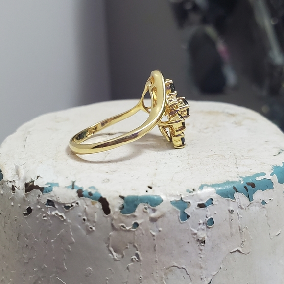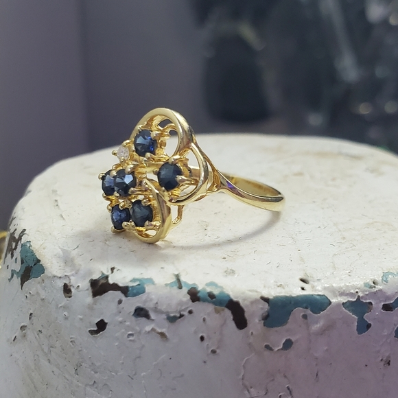 Stunning 14k gold sapphire & diamond ring in EUC the ring has 6 sapphires & 1 diamond.Sz 5.5, 2mm band widthComes from an odor and smoke free environment