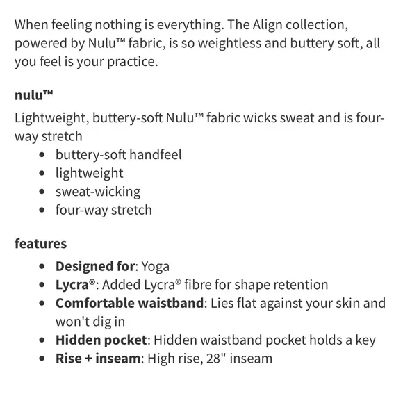Like new condition size 10 flush pink align leggings. 28” inseam. No stains, holes, flaws, pilling or signs of wear. Riptag removed but size dot intact. These are the double lined style.
