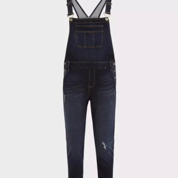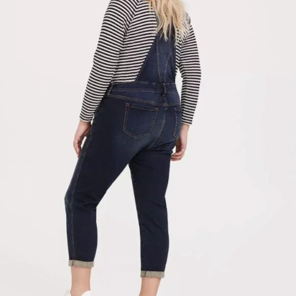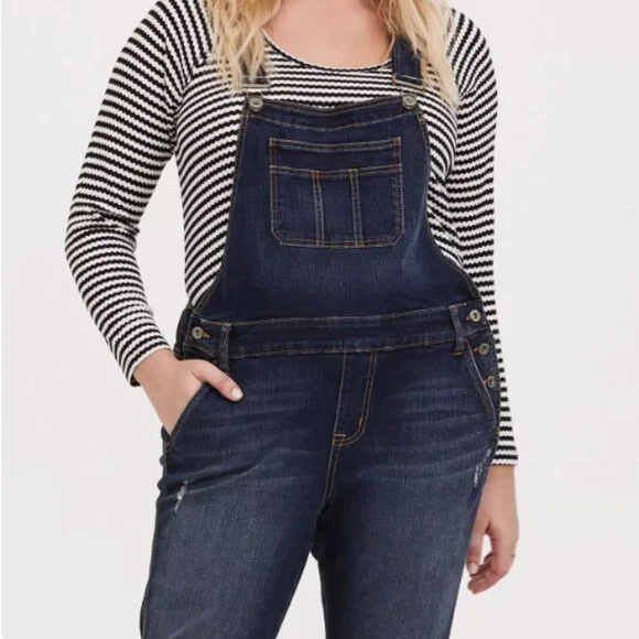 Product DetailsOur overalls have a modern fit that´s tailored to flatter. Fitted through the hip and thighs, you can unroll the cuffs for a straight leg look.Our Vintage Stretch: has the feel and look of classic denim with just a hint of stretch.Suspender strapsSide button closure4-pocket design; bib pocketRolled cuffsIntentional whiskeringDistressedCONTENT + CARECotton/spandexWash cold; dry lowImported plus size jeansSIZE + FIT25" inseam (rolled)TORRID MEASUREMENTBust: 46" - 48"Waist: 40" - 42"Hip: 50" - 52"