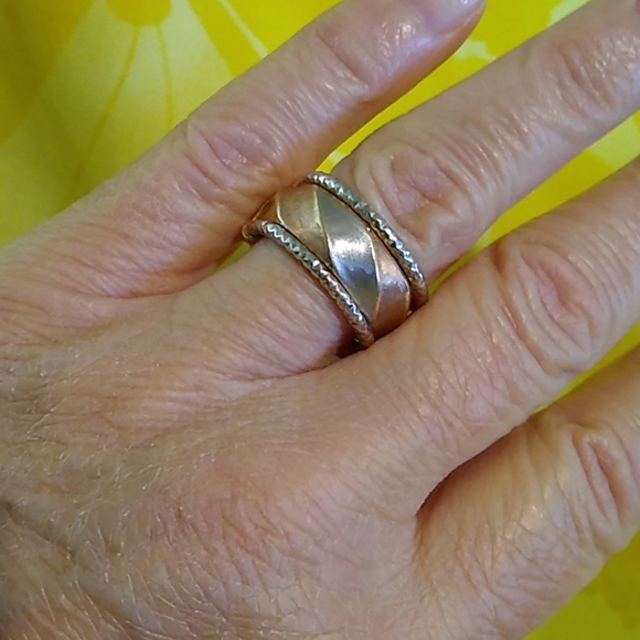 This 14K tri-color wide band ring looks like swirlingribbons of White, Rose and Yellow Gold. The white and rose have asatin finish, and the yellowhas a high polish finish. The ring is bordered in White Gold. It was made in Italy. There is a dent in this ring, but it is in the back by the seam and is not noticeable when being worn. See 2nd pic. I have reduced the list price accordingly. The price is firm and as low as I can go. This is stamped 14K Italy and is 3.4 grams of gold.