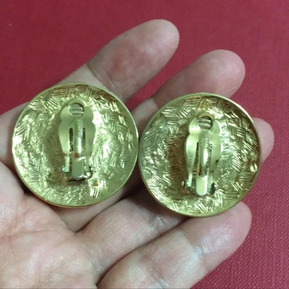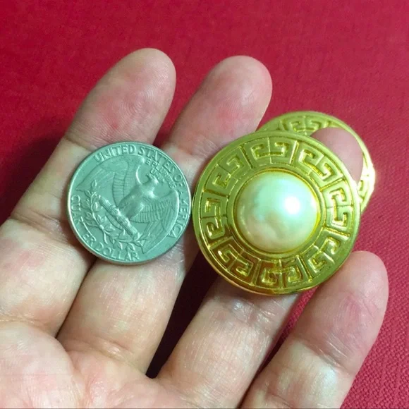 Givenchy Logo Earrings with Simulated Pearl Cabochons feature the Givenchy Logo on a gold plated base with a large pearl cabochon. This design is very popular among the A-list designers and is seen repeatedly which is another reason they´re so coveted. They are signed Givenchy Paris New York, measure 1 3/8" diameter & with the exception of one tiny blemish on one of the pearls and some micro scratches. Overall, they are in excellent condition.