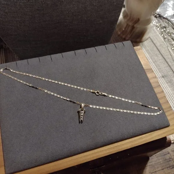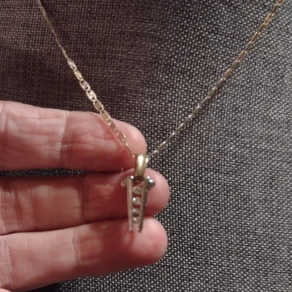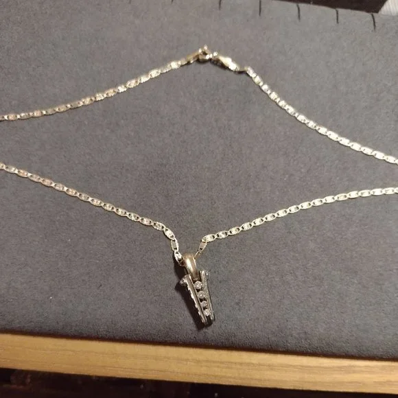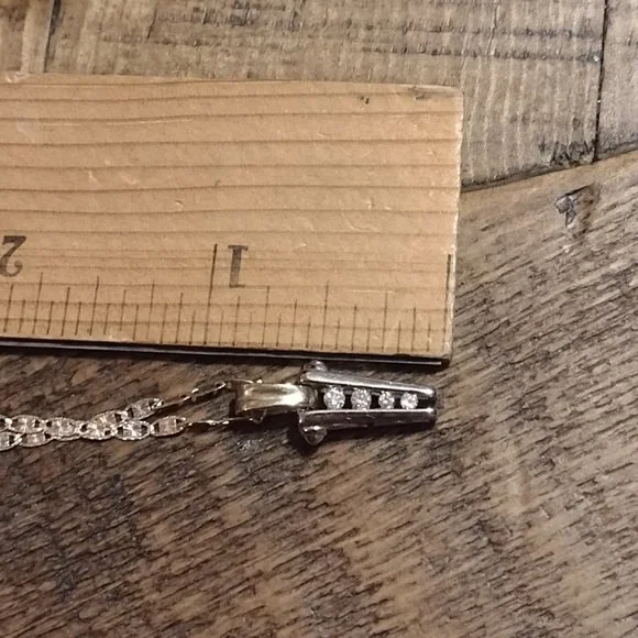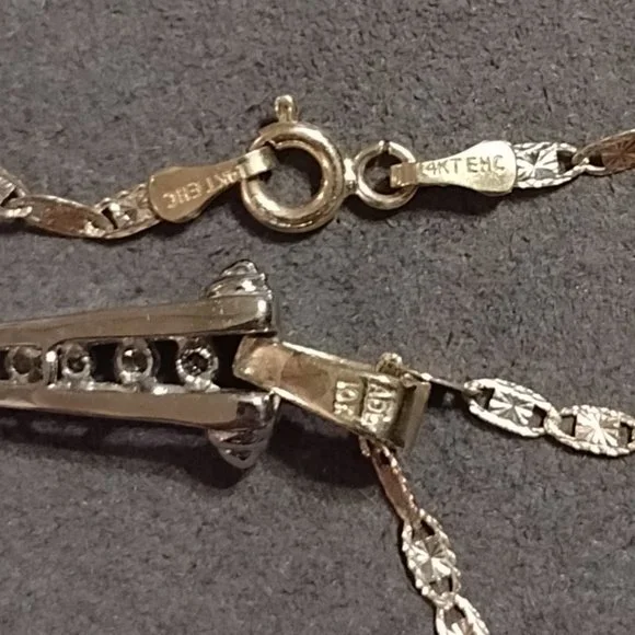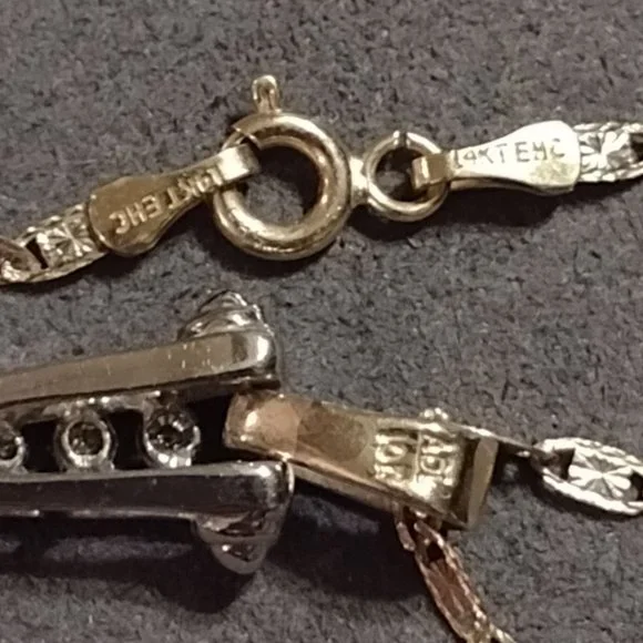 The pendant is marked ADL 10Kit is yellow and White gold diamond Channel 3D Pendant Slidercomposition: 10k Solid White Yellow goldDiamond Weight is Approx. .10cttwDiamond Color Clarity: Approx. i/j -- si/i1Weight (in Grams); 1.3 gsize: .85" long with bale x .35" widest pointComposition of Chain - solid 14k Tri colored goldWeight of chain (in Grams) - 2 gWidth of Chain in MM (Left to Right) - 1.9 mmTotal Length of Chain - 16"Very beautiful set. In excellent pre-owned conditionopen to reasonable offers. Thanks for checking my boutique out!W-2021
