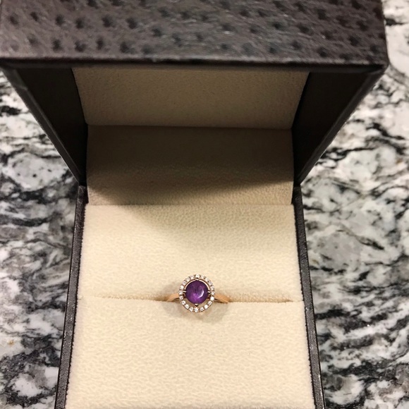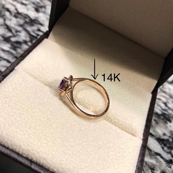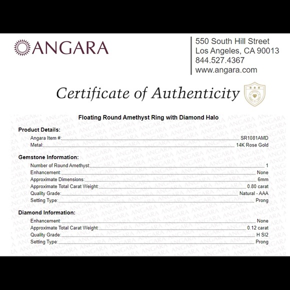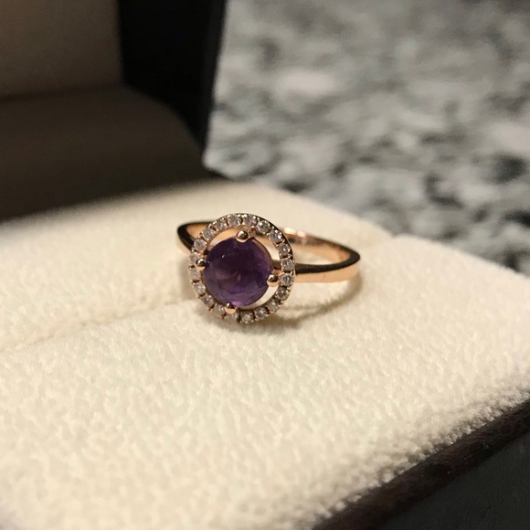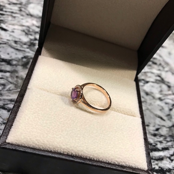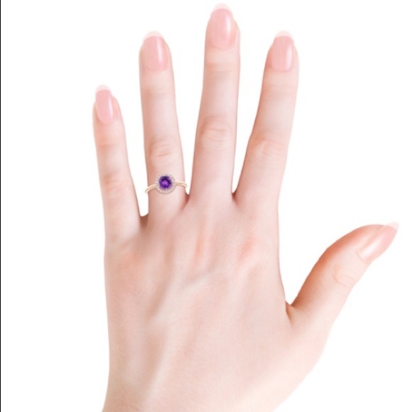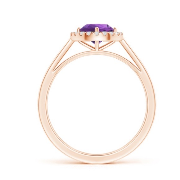 Angara Floating Round Amethyst Ring Diamond Halo, Cathedral Style Shank for Elegant Look. 14K Rose Gold, Amethyst is 0.80 carat and diamonds is 0.12 carat. Size 5, Certificate of Authenticity. "Pre-owned" but shiny/beautiful as new, slight scratches from normal wear. Perfect as promise, engagement, or anniversary ring. Would love for a special lady to enjoy its beauty. February birthstone.Link to original seller: https://www.angara.com/p/floating-diamond-halo-amethyst-cathedral-ring-sr1081amd