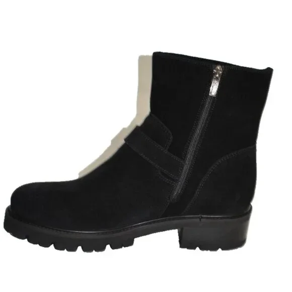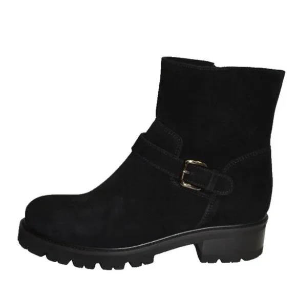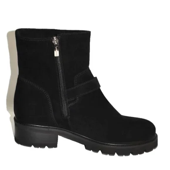 New! LA CANADIENNE 10 M Kian Suede Buckle Bootie Waterproof Platform Black DD504MSRP $550New Without Box-Floor Display Like New-Guaranteed AuthenticityNo Shoe Box/BagTrue to size.Details & careThe brand´s signature City Dry waterproofing and memory foam insole bring comfort to every step in a handmade suede bootie set upon a lightweight lugged sole.1 1/2" heel; 1" platform 6" shaft, 11" circumference Waterproof: protects against rain, puddles and slush to keep feet dry in wet conditionsSide zip closureMemory foam cushioning with arch supportHandcraftedLeather upper/textile lining/rubber soleMade in CanadaMaterial: SuedeLining: MicrofiberSole Material: Thermoplastic rubber1 1/2" HEEL 1" PLATFORM