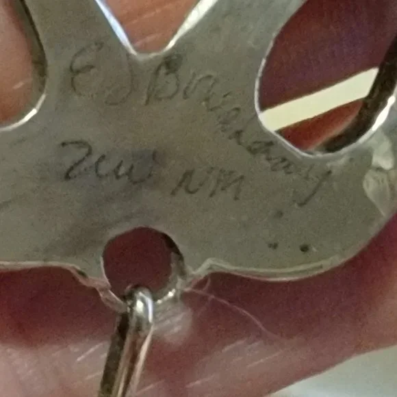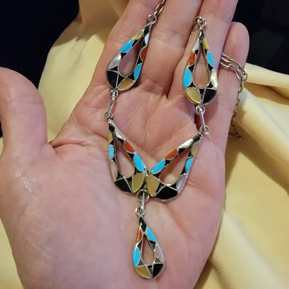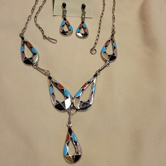 Zuni Multi-Gemstone Inlay Pendant & Earrings - Signed - Ed BStunning Zuni multi-gemstone drop necklace & earring set.Includes Turquoise, Mother of Pearl, Coral, Carnelian, and Onyx inlayed in sterling silver. This is a gorgeous pendant with 5 separate inlay pieces tear dropping down.Signed by Ed B...(difficult to read his last name).Gorgeous inlay set.Details:Length:Up to 20" but can be shortened by hooking higher up***Each Tear Drop is 1 1/4", lowest hanging one is 1"Width: 1/4" at widest stoneEarrings hang right at 1 1/2" (post)Weight:14.2 grams on necklace & 5.2 grams on earrings***Thank you for looking and please view my other items listed.Have a fabulous day.