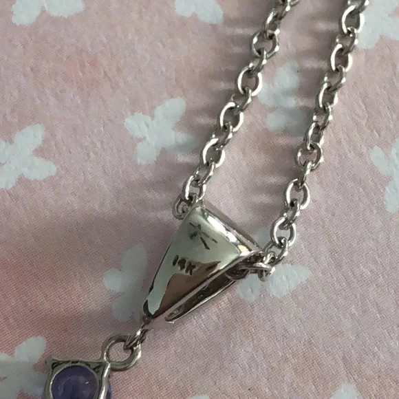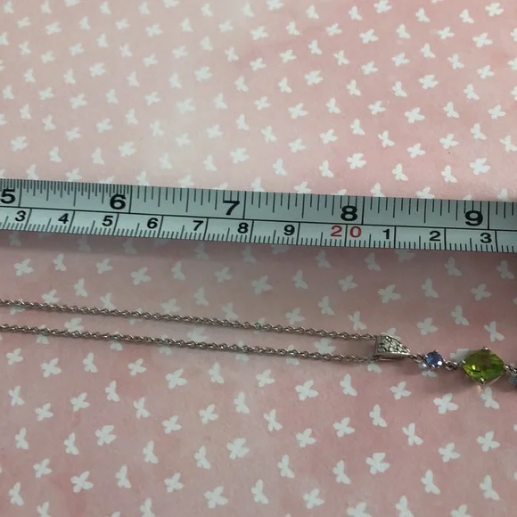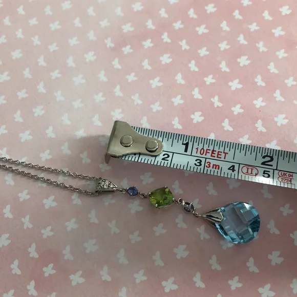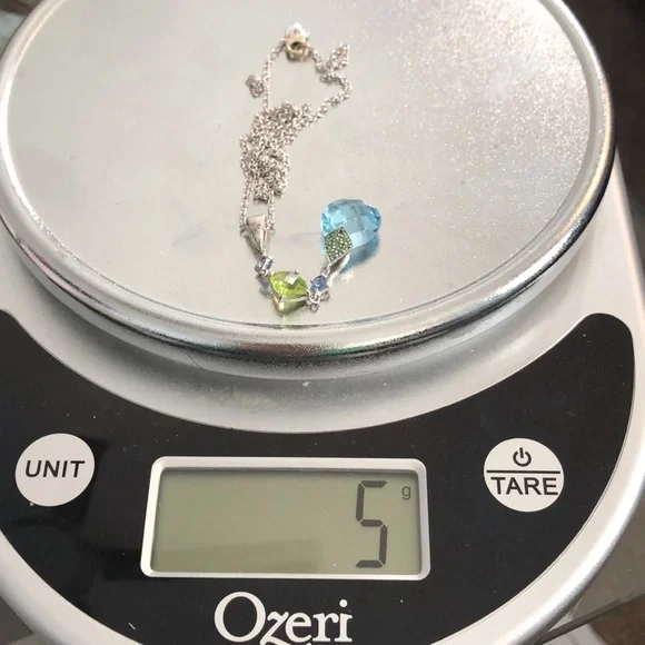 14k white gold necklace. There is a large blue topaz, a smaller peridot , two small tanzanite stones, tiny diamonds, and tsavorite stones. I used a magnifying glass to take...