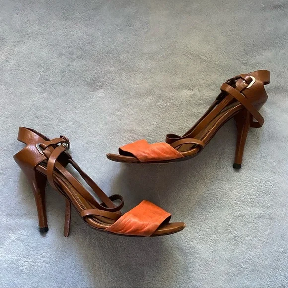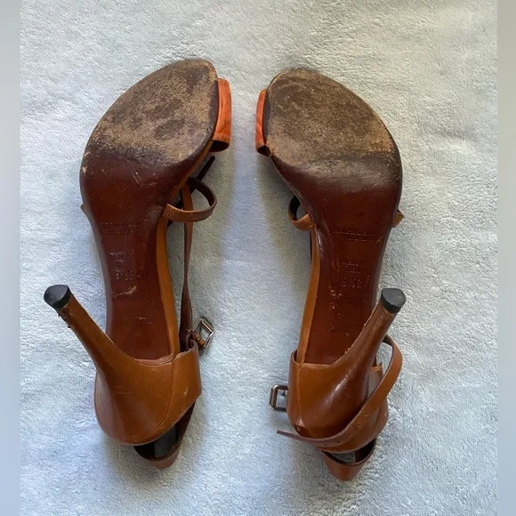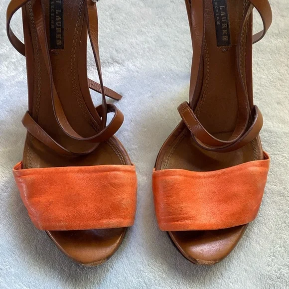 Vintage Ralph Lauren Purple Label Collection Strappy Heels - Made in Italy. Tan leather with an orange leather toe strap. These were my favorite heels for years and show some signs of wear, but they’re still gorgeous. I recently had the heel taps restored and the leather cleaned.