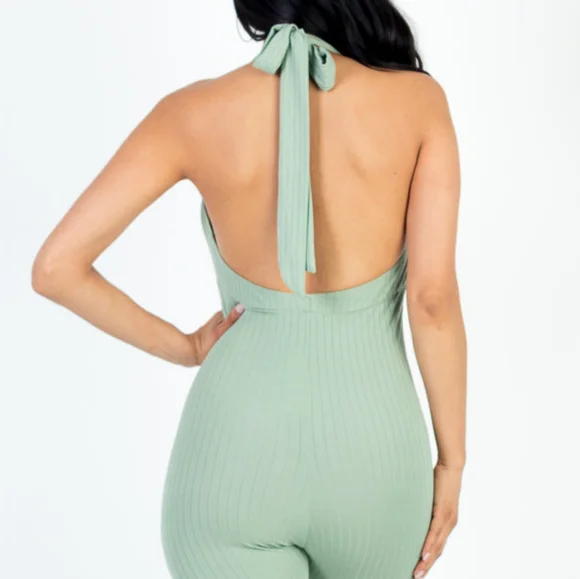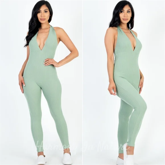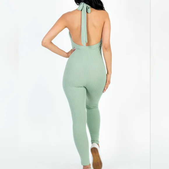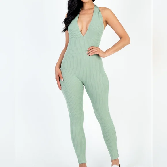 With its deep V neckline and curve-hugging ribbed fabric, this bodycon jumpsuit is designed to make a statement. It moves with you while flattering every angle, available in a range of bold and neutral shades to suit your mood. Pair it with oversized sunnies and platform sandals for a fierce daytime look, or throw on a cropped leather jacket and heels to take it into the night.Halter tieSleeveless Ribbed knitModerate stretchSHIPS IN 7 TO 10 DAYS Item Size Conversion Chart (SIZE TAGS ARE LETTERS)X-Small - 0Small - 2/4Medium - 6Large - 8/10Shop our full collection of: girly bohemian baggy drapey butterfly geometric colorblock racerback plaid gingham leopard cheetah summer spring gypsy blouse winter blazer pants romantic satin pastel hippie gift resort y2k eyelet minimalist holiday chic casual classic layered vibe retro wedding guest date night beachy baggy flirty maxi valentine´s backless classy sexy slouchy tropical floral workplace sequin cowl neck bright crop exercise chain strap loose fit contemporary bridesmaid fall autumn work relaxed vintage engagement party Christmas cruise travel thanksgiving camouflage spotted birthday flowy ribbed houndstooth professional Tiktok famous baddie instabaddie 90´s clean beauty mini 70´s Coachella oversized western aesthetic camo slip cable knit linen getaway cotton nylon snakeskin trim halter long sleeve 80´s crossover chambray short sleeve embroidered sheer pleated off the shoulder