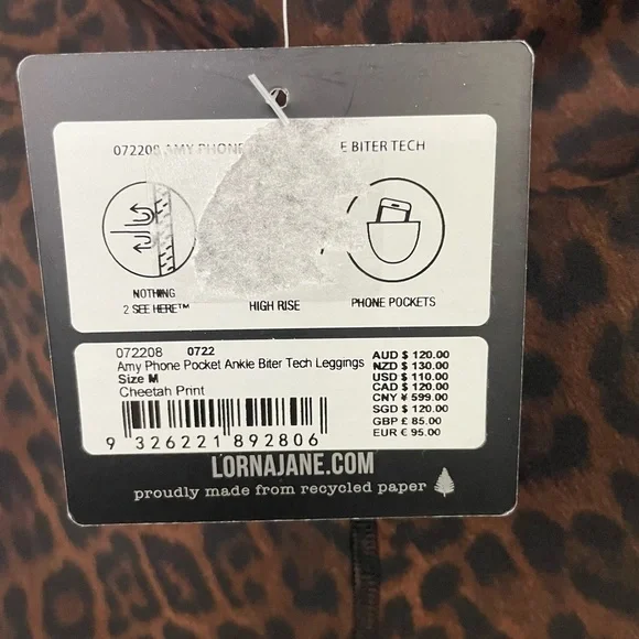 Lorna Jane Amy Phone Pocket Ankle Biter Tech Leggings. In Cheetah Print. Side phone pocket. Flatlock seams. Condition – brand new with tag, tag has some damage. Size – medium...