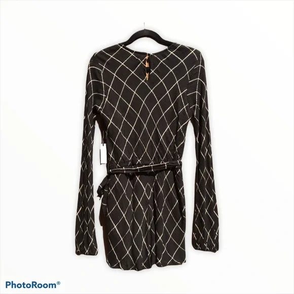 NWT Lovers + Friends “Chateau" V-Neck Romper. A sexy romper in a classic, diamond-pane print with a plunging v-neck, long sleeves, and a matching belt to tie around the waist....